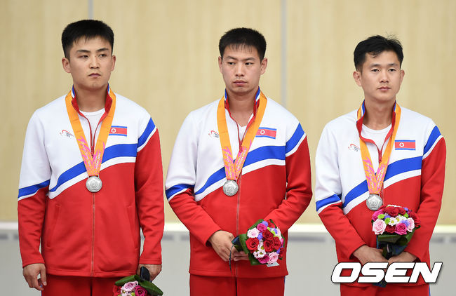 단체 시상식에서 은메달을 획득한 북한 선수들이 기념촬영을 하고 있다. /sunday@osen.co.kr