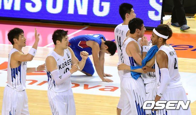 공격의 시작도 끝도 모두 문태종(39, LG)이었다. 문태종이 다 죽어가던 한국을 살렸다. 유재학 감독이 이끄는 남자농구 대표팀은 27일 인천 삼산체육관에서 벌어진 2014 인천 아시안게임 남자농구 8강 결선리그 H조 2차전에서 필리핀을 접전 끝에 97-95로 이겼다. 이로써 한국은 지난해 아시아선수권 준결승전에서 필리핀에 패한 통쾌한 복수를 했다. 한국은 28일 카타르마저 꺾을 경우 조 1위로 준결승에 진출할 가능성이 높아졌다. 이날 패한 필리핀은 탈락이 확정됐다. 승리를 거둔 대표팀 선수들이 기뻐하고 있다. / youngrae@osen.co.kr