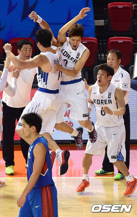 공격의 시작도 끝도 모두 문태종(39, LG)이었다. 문태종이 다 죽어가던 한국을 살렸다. 유재학 감독이 이끄는 남자농구 대표팀은 27일 인천 삼산체육관에서 벌어진 2014 인천 아시안게임 남자농구 8강 결선리그 H조 2차전에서 필리핀을 접전 끝에 97-95로 이겼다. 이로써 한국은 지난해 아시아선수권 준결승전에서 필리핀에 패한 통쾌한 복수를 했다. 한국은 28일 카타르마저 꺾을 경우 조 1위로 준결승에 진출할 가능성이 높아졌다. 이날 패한 필리핀은 탈락이 확정됐다. 양희종, 김선형이 기뻐하고 있다. / youngrae@osen.co.kr