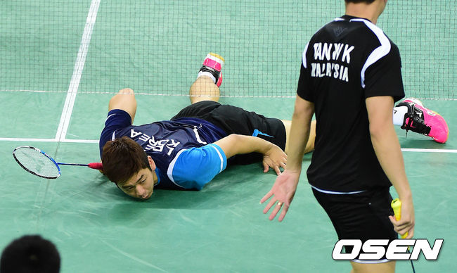 27일 오후 인천 계양체육관에서 열린 2014 인천 아시안게임 남자 배드민턴 복식 4강전 경기 한국과 말레이시아의 경기, 이용대가 몸을 날려 셔틀콕을 받으려 했지만 놓쳐 넘어져 있다.