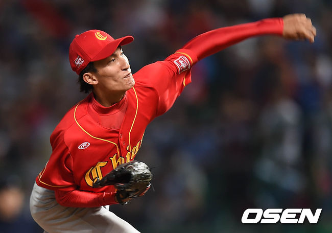 1회말 중국 선발투수 리신이 힘차게 공을 던지고 있다.