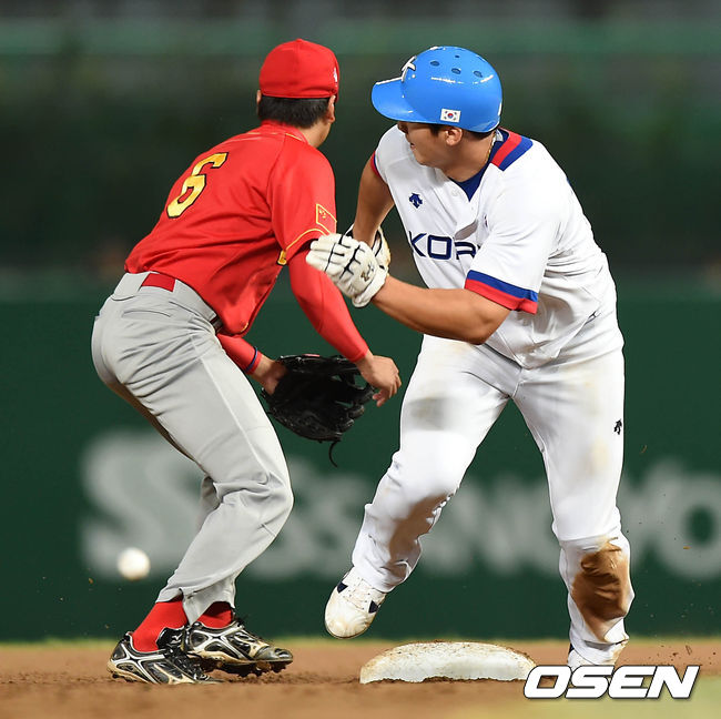 5회초 1사 1루에서 한국 황재균 타석때 2루 도루에 성공한 1루주자 나성범이 공이 빠진틈을 타 홈으로 쇄도하고 있다.
