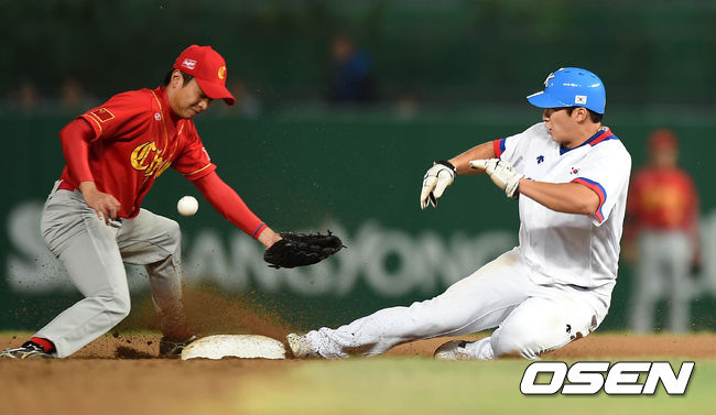 5회초 1사 1루에서 한국 황재균 타석때 2루 도루에 성공한 1루주자 나성범이 공이 빠진틈을 타 홈으로 쇄도하고 있다.