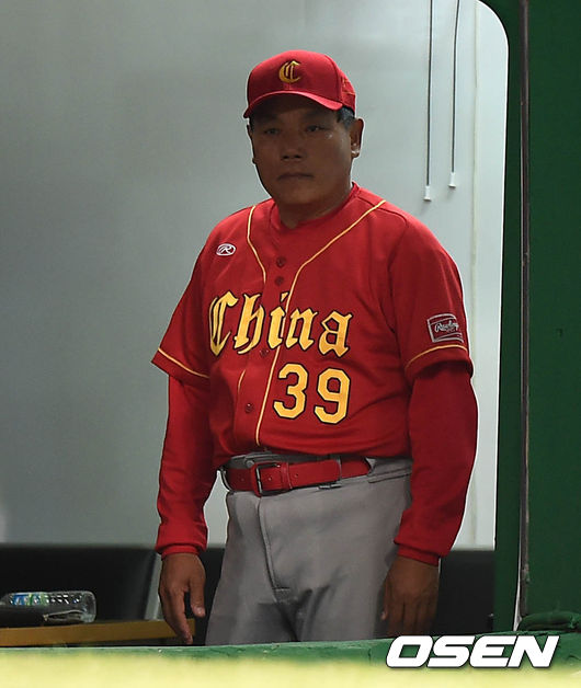 7회말 중국 송핑샨 감독이 경기를 바라보고 있다.