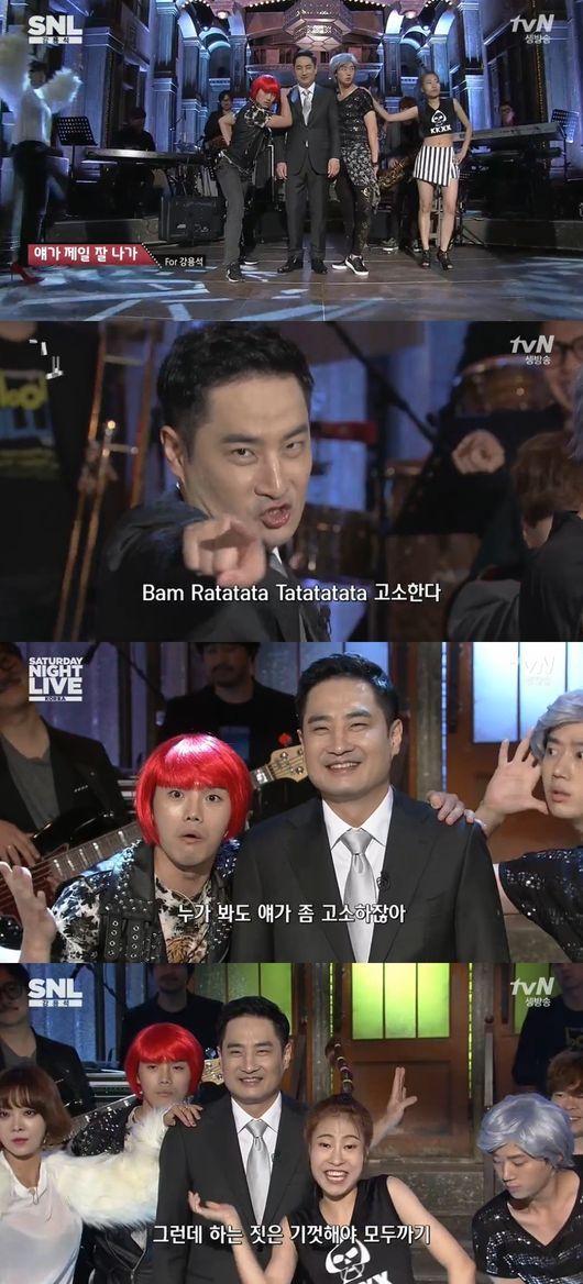 강용석은 등장과 함께 SNL크루와 함께 2NE1의 ‘내가 제일 잘 나가’를 개사한 ‘얘가 제일 잘 나가’를 선보였다. 노래는 SNL크루가 불렀지만, 강용석은 재치 있는 표정과 안무로 함께 해 웃음을 자아냈다.