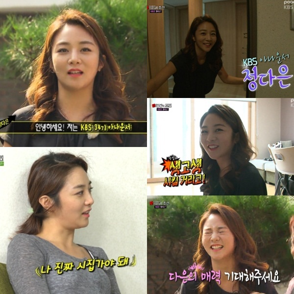 정다은 아나운서는 ‘두근두근 로맨스 30일’, ‘해피선데이 1박2일’, ‘가족의 품격 풀하우스’ 등의 예능프로그램에 출연하며 대중에 더욱 친숙한 인물로, 예쁜 외모와 지적인 이미지로 사랑 받고 있다. 하지만 이날 방송에서 ‘인간의 조건’에 먼저 출연했던 박은영 아나운서의 성대모사로 그를 험담하는 모습을 보이거나, 새벽 출근에도 적극적으로 미션에 임하는 모습, 또 꾸미지 않은 민낯까지 공개하며 그간 방송을 통해 볼 수 없던 털털한 모습을 보여준 그는 다양한 매력으로 프로그램에 활력을 더했다는 평이다.