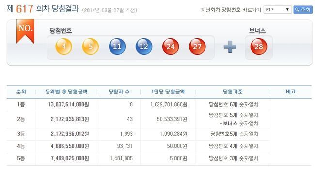 나눔로또는 27일 오후 로또 617회당첨번호를 발표했다. 당첨번호는 4, 5, 11, 12, 24, 27이며 2등 보너스 번호는 28이다.