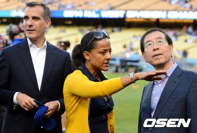 경기에 앞서 박원순 서울 시장이 다저스타디움을 찾아 안전 관련 사항을 체크하며 야구장을 둘러보고 있다.