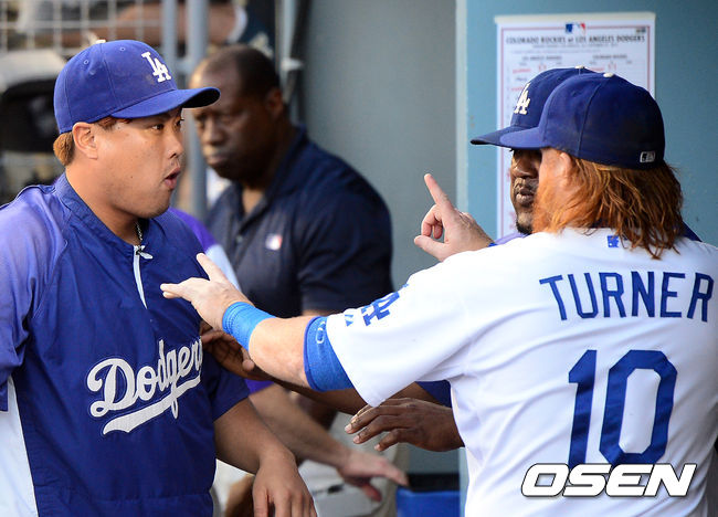 경기에 앞서 다저스 류현진이 유리베와 장난을 치자 터너가 이를 말리고 있다.