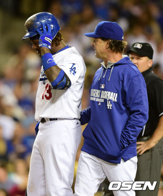 4회말 무사에서 다저스 라미레즈가 본인의 파울타구에 다리를 맞아 괴로워하자 매팅리 감독이 그라운드에 나와 상태를 체크하고 있다.