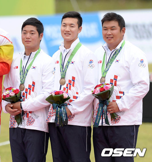 동메달을 차지한 한국 남자 리커브 대표팀이 기념촬영을 하고 있다. /sunday@osen.co.kr