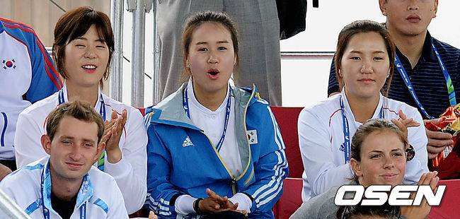 전날 금메달을 차지한 한국 여자 컴파운드 대표팀이 관중석에서 리커브 대표팀을 응원하고 있다. /sunday@osen.co.kr