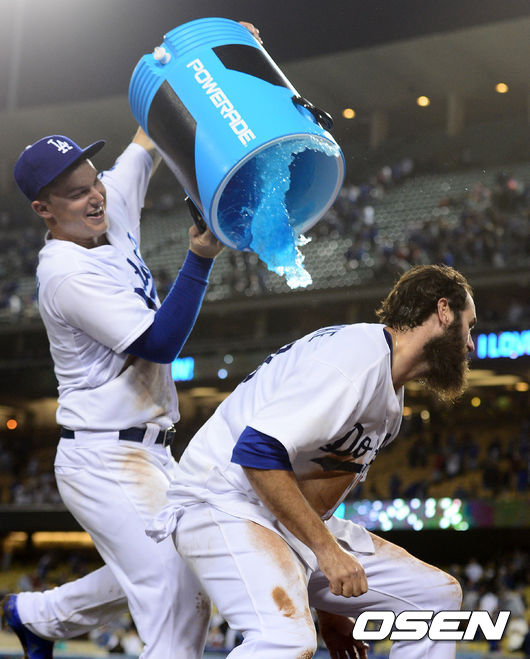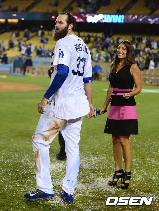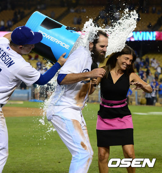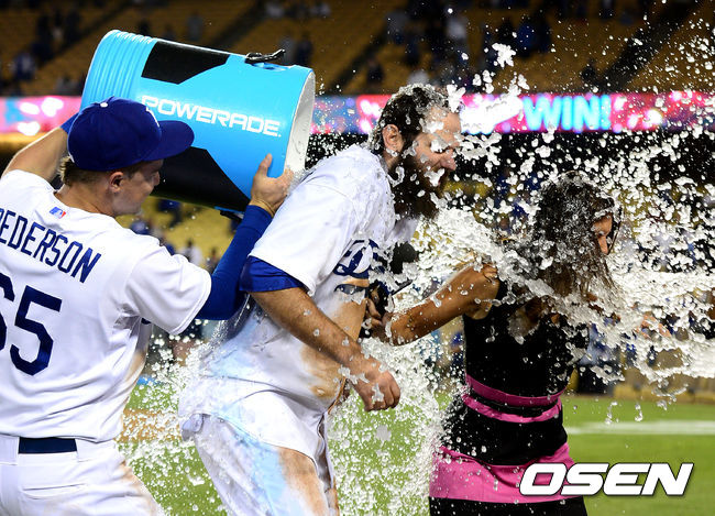 연장 12회말 1사 1,3루에서 다저스 로하스의 폭투에 밴 슬라이크가 홈을 밟고 경기를 승리로 이끌었다. 밴 슬라이크가 히어로 인터뷰를 하며 피더슨의 첫번째 물세례를 눈치채고 피했지만 두번째에는 무방비 상태로 여자 아나운서와 물세례를 받고 깜짝 놀라고 있다. /jpnews@osen.co.kr
