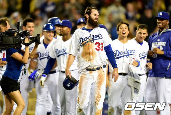 연장 12회말 1사 1,3루에서 다저스 로하스의 폭투에 밴 슬라이크가 홈을 밟고 동료선수들의 축하를 받고 있다. /jpnews@osen.co.kr