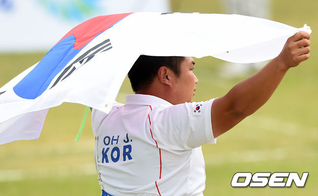 금메달을 획득한 한국 오진혁이 태극기를 들고 환호하고 있다. /sunday@osen.co.kr