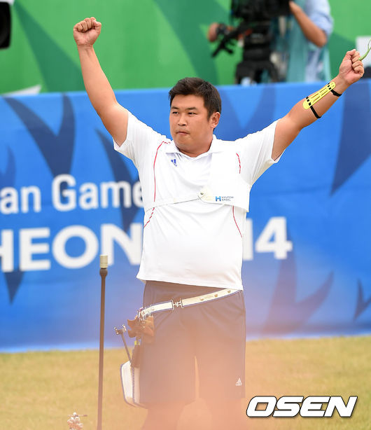 28일 인천 계양아시아드양궁장에서 열린 2014 인천 아시안게임 양궁 남자 리커브 개인전 결승에서 오진혁은 용지웨이(중국)에 6-4로 짜릿한 역전승을 거두고 금메달을 차지했다. 남자 선수 중 유일하게 개인전 결승까지 갔던 오진혁은 노골드 위기에 빠졌던 한국 남자 양궁의 자존심을 지켰다.