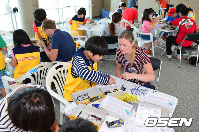 넥센타이어 잉글리시 키즈 투어에 참가한 어린이들이 외국인 선생님들과 함께 미니카를 만들고 있다./dreamer@osen.co.k