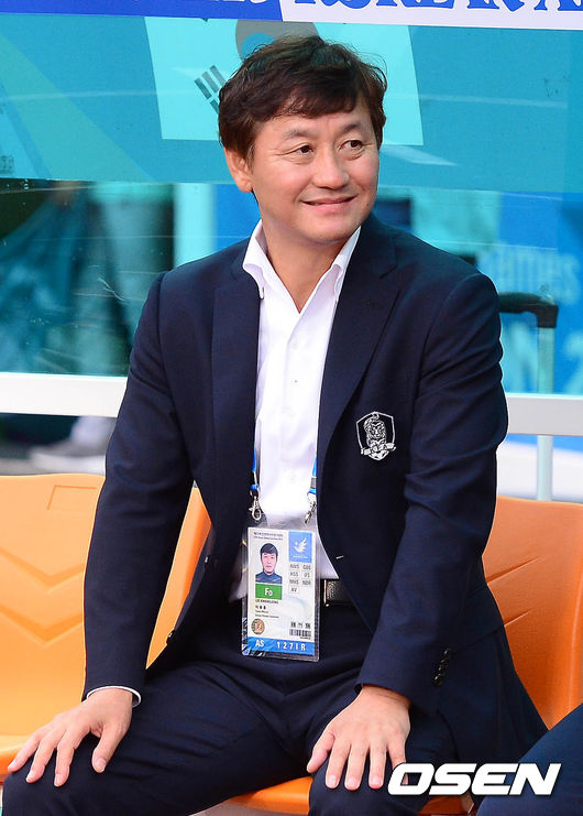 28일 오후 인천 문학경기장에서 열린 2014 인천 아시안게임 남자 축구 8강전 한국과 일본의 경기 시작전 이광종 감독이 벤치에 앉아 미소를 짓고 있다.