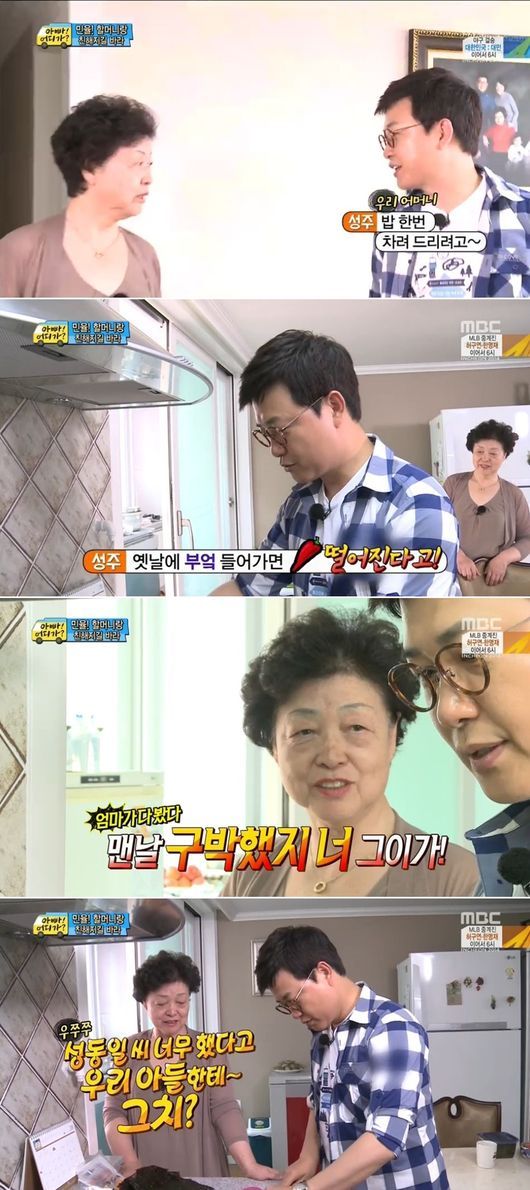 28일 오후 방송된 MBC 예능프로그램 ‘일밤 - 아빠! 어디가?’(이하 ‘아빠 어디가’)에서 손자 민율과 함께 시간을 보낸 어머니에게 직접 요리를 해주는 김성주의 모습이 그려졌다.