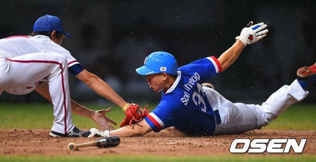 28일 오후 인천 문학야구장에서 열린 2014 인천 아시안게임 야구 결승전 한국과 대만의 경기 5회초 2사 1,3루 김현수의 내야땅볼때 대만 수비의 실책으로 홈쇄도한 1루 주자 손아섭이 홈에서 태그아웃되고 있다