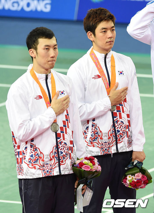 은메달을 차지한 한국 유연성과 이용대가 인도네시아의 국가를 듣고 있다. /sunday@osen.co.kr