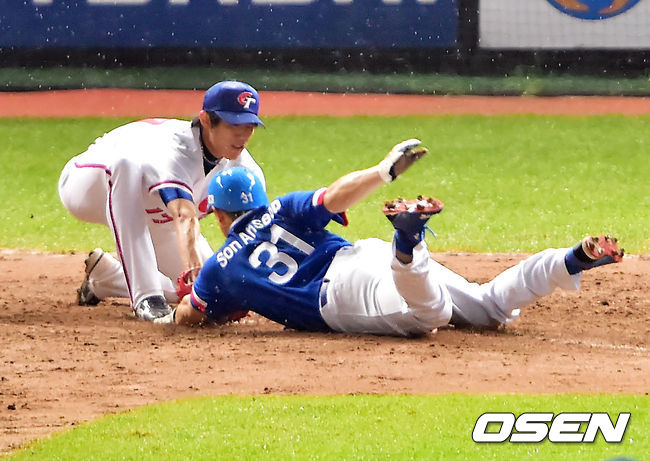 28일 오후 인천 문학야구장에서 열린 2014 인천 아시안게임 야구 결승전 한국과 대만의 경기 5회초 2사 1,3루 김현수의 내야땅볼때 대만 수비의 실책으로 홈쇄도한 1루 주자 손아섭이 홈에서 태그아웃되고 있다