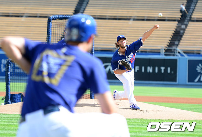 경기에 앞서 다저스 커쇼가 시뮬레이션 피칭을 하고 있다.