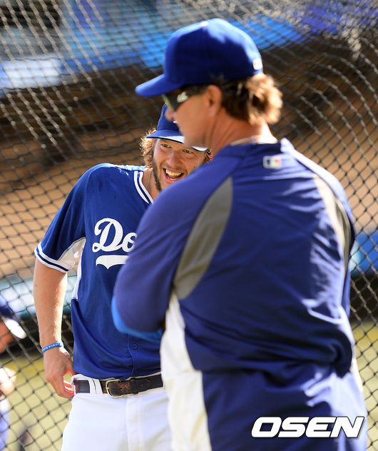 경기에 앞서 다저스 커쇼가 시뮬레이션 피칭을 준비하며 매팅리 감독과 이야기를 나누고 있다.