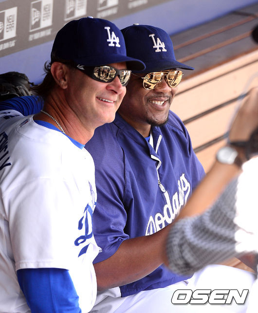 경기에 앞서 다저스 유리베가 매팅리 감독과 포즈를 취하고 있다.