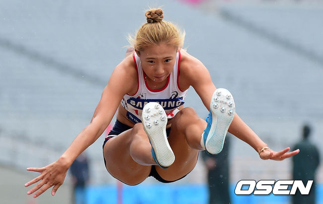 29일 오전 인천 아시아드 주경기장에서 열린 제17회 인천 아시안게임 육상 여자 7종경기 멀리뛰기 경기에서 정연진이 경기를 펼치고 있다.