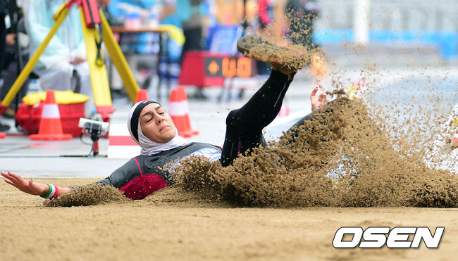 29일 오전 인천 아시아드 주경기장에서 열린 제17회 인천 아시안게임 육상 여자 7종경기 멀리뛰기 경기에서 이란 타바콜리가 착지를 하고 있다.