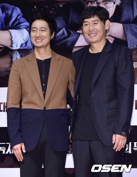 29일 오전 서울시 광진구 롯데시네마 건대입구점에서 열린 영화 '나의 독재자' 제작발표회에서 배우 박해일, 설경구가 포토타임을 갖고 있다.