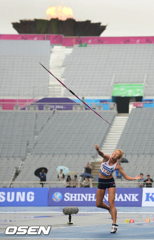 29일 오전 인천 아시아드 주경기장에서 열린 제17회 인천 아시안게임 육상 여자 7종경기 창던지기 경기에서 정연진이 경기를 펼치고 있다.