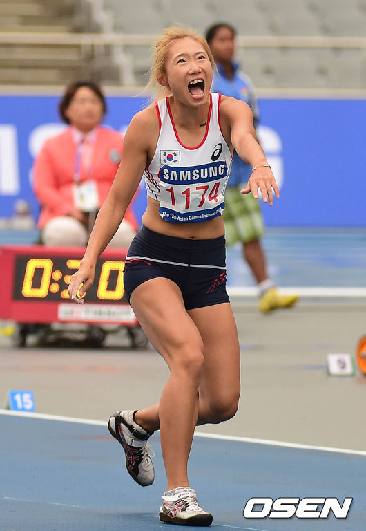 29일 오전 인천 아시아드 주경기장에서 열린 제17회 인천 아시안게임 육상 여자 7종경기에서 정연진이 창던지기를 하고 있다.