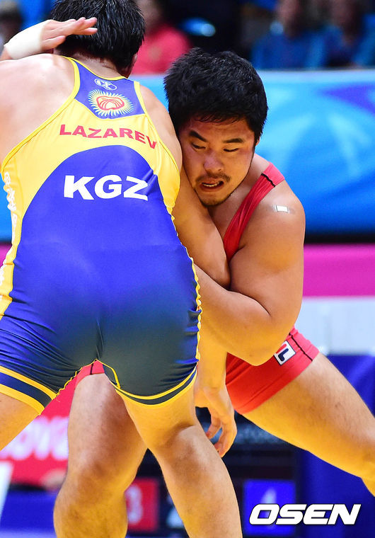 29일 오후 인천 도원체육관에서 열린 제17회 인천 아시안게임 레슬링 남자 자유형 125kg 8강에서 남경진이 경기를 펼치고 있다.