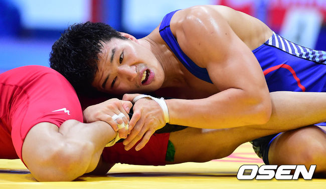 29일 오후 인천 도원체육관에서 열린 제17회 인천 아시안게임 레슬링 남자 자유형 74kg 4강전에서 이상규가 경기를 펼치고 있다.