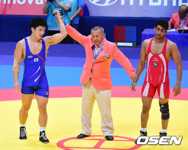 29일 오후 인천 도원체육관에서 열린 제17회 인천 아시안게임 레슬링 남자 자유형 74kg 동메달 결정전에서 이상규가 승리를 거두고 있다.