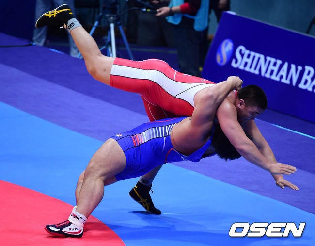 29일 오후 인천 도원체육관에서 열린 제17회 인천 아시안게임 레슬링 남자 자유형 125kg 동메달 결정전에서 남경진이 경기를 펼치고 있다.