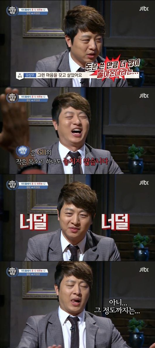 유상무는 29일 방송된 JTBC 예능프로그램 ‘비정상회담’에서 돈이 없어도 주변 사람들에게 돈을 퍼주는 습관에 대해 고민을 밝혔다.