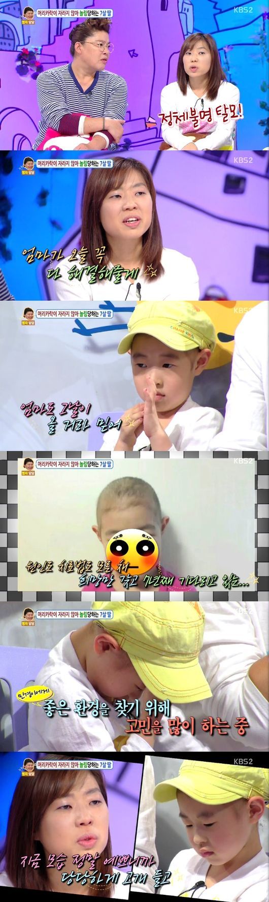 29일 오후 방송된 KBS 2TV '대국민 토크쇼 안녕하세요'에는 머리카락이 자라지 않는 딸이 고민인 민경이 엄마의 사연이 전파를 탔다.