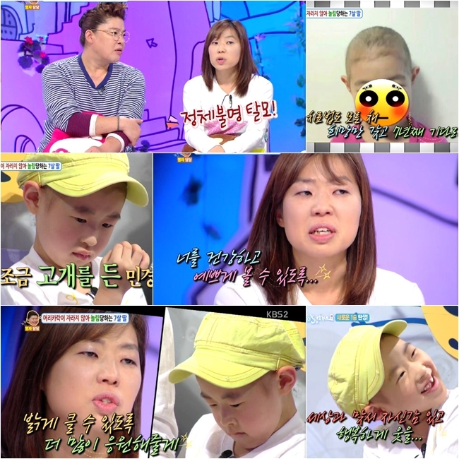 머리카락이 자라지 않아 놀림을 당하는 7살 민경이가 ‘안녕하세요’에 등장했다. 민경이의 어머니는 방송 출연이 옳은 결정인지는 잘 모르겠지만, 딸이 예쁘고 건강하게 자랄 수 있도록 주변에서 도와달라고 눈물로 호소했다.