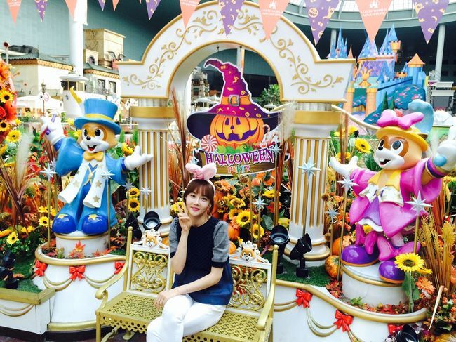 사진 속 황우슬혜는 놀이 공원을 배경으로 미소를 지으며 깜찍한 자태를 뽐내고 있다.