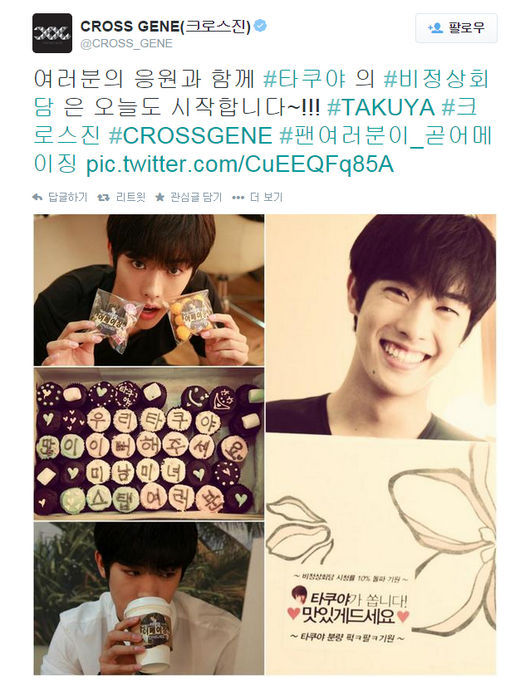 타쿠야는 지난 29일 크로스진의 공식 트위터 계정을 통해 “여러분의 응원과 함께 타쿠야의 비정상회담은 오늘도 시작합니다~! TAKUYA 크로스진 CROSSGENE 팬여러분이_곧 어메이징”이라는 글과 사진을 게재, 팬들에게 고마운 마음을 전한 것.