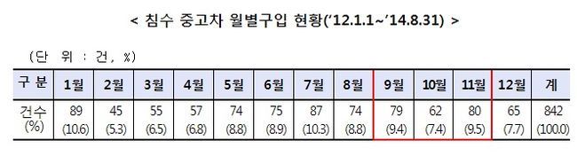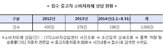 한국소비자원은 침수된 중고차를 구입해 피해를 보았다는 상담이 2012년부터 2014년 8월 31일까지 1372 소비자상담센터에 1006건 접수됐으며 특히 가을철인 9월~11월에 피해를 본 경우가 26.3%(구입 시점이 확인 가능한 842건 중 221건)였다고 밝혔다.
