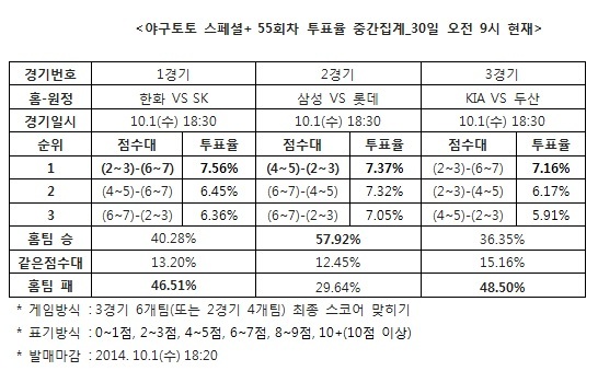 [야구토토] 국민체육진흥공단(www.kspo.or.kr)이 발행하는 체육진흥투표권 수탁사업자인 스포츠토토의 공식 온라인 발매 사이트 베트맨(www.betman.co.kr)이 내달 1일에 열리는 한국프로야구(KBO) 3경기를 대상으로 한 야구토토 스페셜+ 55회차 투표율을 중간 집계한 결과, 참가자의 46.51%는 한화-SK(1경기)전에서 SK가 한화에 승리할 것이라 예상했다.