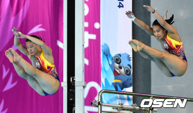30일 오후 인천 문학박태환수영장에서 열린 제17회 인천 아시안게임 다이빙 여자 싱크로나이즈 10m 플랫폼 결승전에서 조은비, 김수지가 다이빙을 하고 있다.