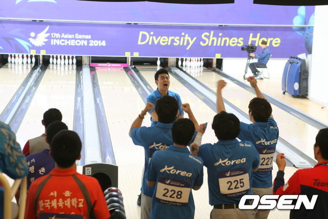 박종우(23, 광양시청), 최복음(27, 광양시청), 김경민(30, 인천교통공사), 신승현(25, 수원시청), 강희원(32, 부산광역시청), 홍해솔(24, 인천교통공사)로 구성된 한국은 30일 안양호계체육관에서 열린 2014 인천아시안게임 볼링 남자 5인조전에서 합계 6228점을 쳐 정상에 올랐다.