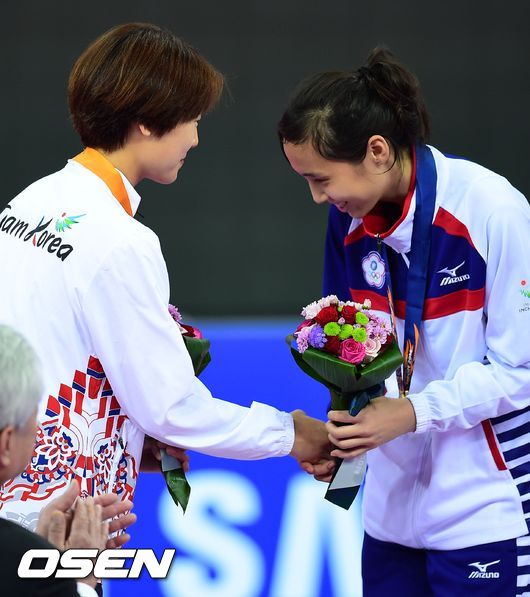 시상식에서 은메달을 획득한 윤정연이 후앙윤엔에게 축하의 인사를 건네고 있다. / soul1014@osen.co.kr