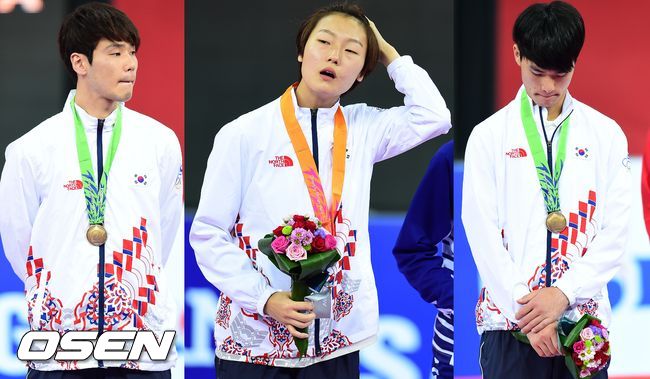 시상식에서 동메달을 차지한 신영래, 은메달 윤정연, 동메달 송영건이 아쉬운 표정을 짓고 있다 . / soul1014@osen.co.kr