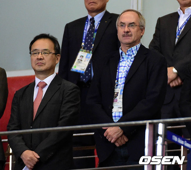 30일 오후 인천 문학경기장에서 열린 제17회 인천 아시안게임 남자 축구 4강전 한국과 태국의 경기 시작전 슈틸리케 감독과 이용수 기술위원장이 귀빈석에 서 있다.
